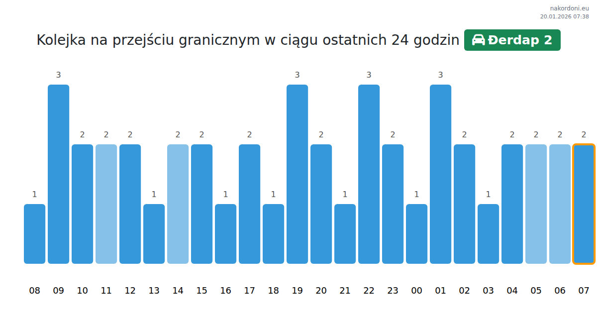 Planuj swoje podróże z wyprzedzeniem, korzystając z aktualnych informacji o kolejkach na granicy na punkcie kontrolnym Đerdap 2 - samochód osobowy, aby przejazd był szybki i wygodny. Zwróć szczególną uwagę na te godziny, aby uniknąć szczytowego natężenia i skrócić czas oczekiwania.