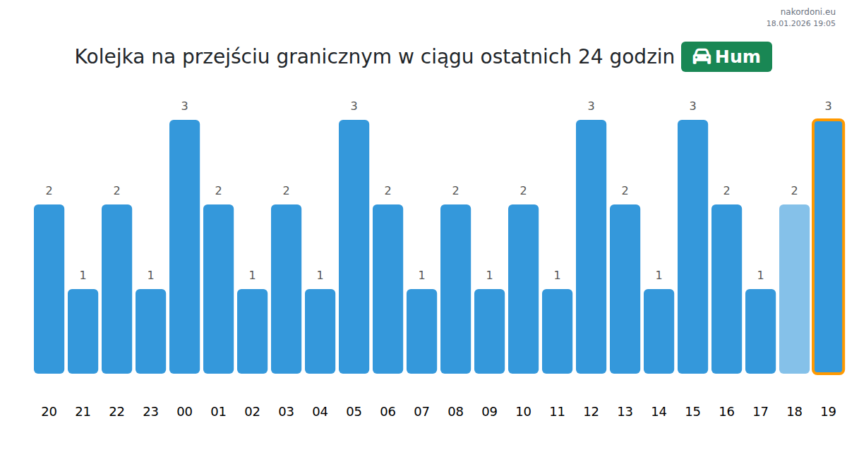 Aby uniknąć długich kolejek na granicy na punkcie kontrolnym Hum - samochód osobowy, zaleca się planowanie przekraczania granicy w godzinach najmniejszego obciążenia. Według danych z ostatniego dnia, najmniejsza liczba pojazdów była obserwowana między 1:00 a 4:00 godziną. To idealny czas na przekroczenie granicy, oszczędzając czas i unikając opóźnień.