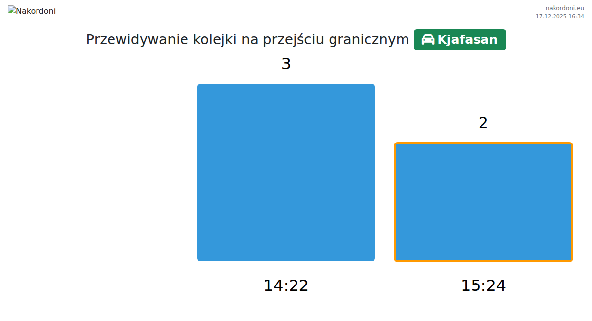 Planuj swoje podróże z wyprzedzeniem, korzystając z aktualnych informacji o kolejkach na granicy na punkcie kontrolnym Kjafasan - samochód osobowy, aby przejazd był szybki i wygodny. Zwróć szczególną uwagę na te godziny, aby uniknąć szczytowego natężenia i skrócić czas oczekiwania.