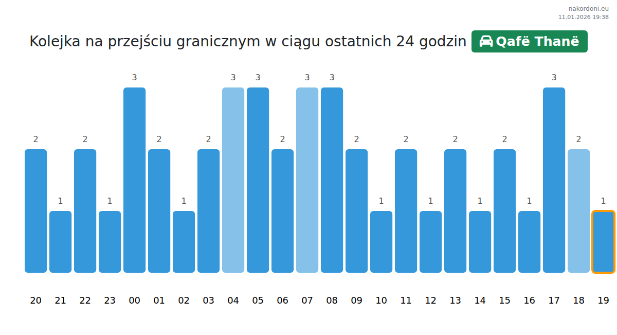 Planuj swoje podróże z wyprzedzeniem, korzystając z aktualnych informacji o kolejkach na granicy na punkcie kontrolnym Qafë Thanë - samochód osobowy, aby przejazd był szybki i wygodny. Zwróć szczególną uwagę na te godziny, aby uniknąć szczytowego natężenia i skrócić czas oczekiwania.