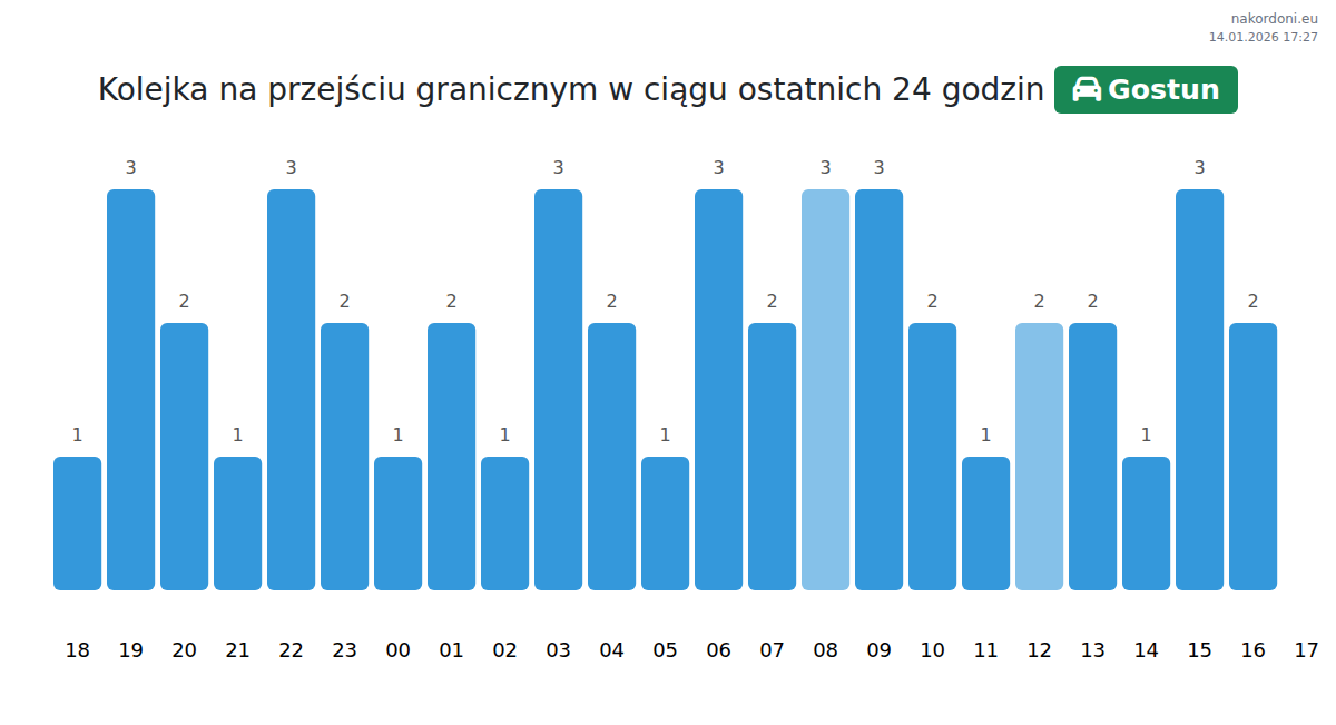 Planuj swoje podróże z wyprzedzeniem, korzystając z aktualnych informacji o kolejkach na granicy na punkcie kontrolnym Gostun - samochód osobowy, aby przejazd był szybki i wygodny. Zwróć szczególną uwagę na te godziny, aby uniknąć szczytowego natężenia i skrócić czas oczekiwania.