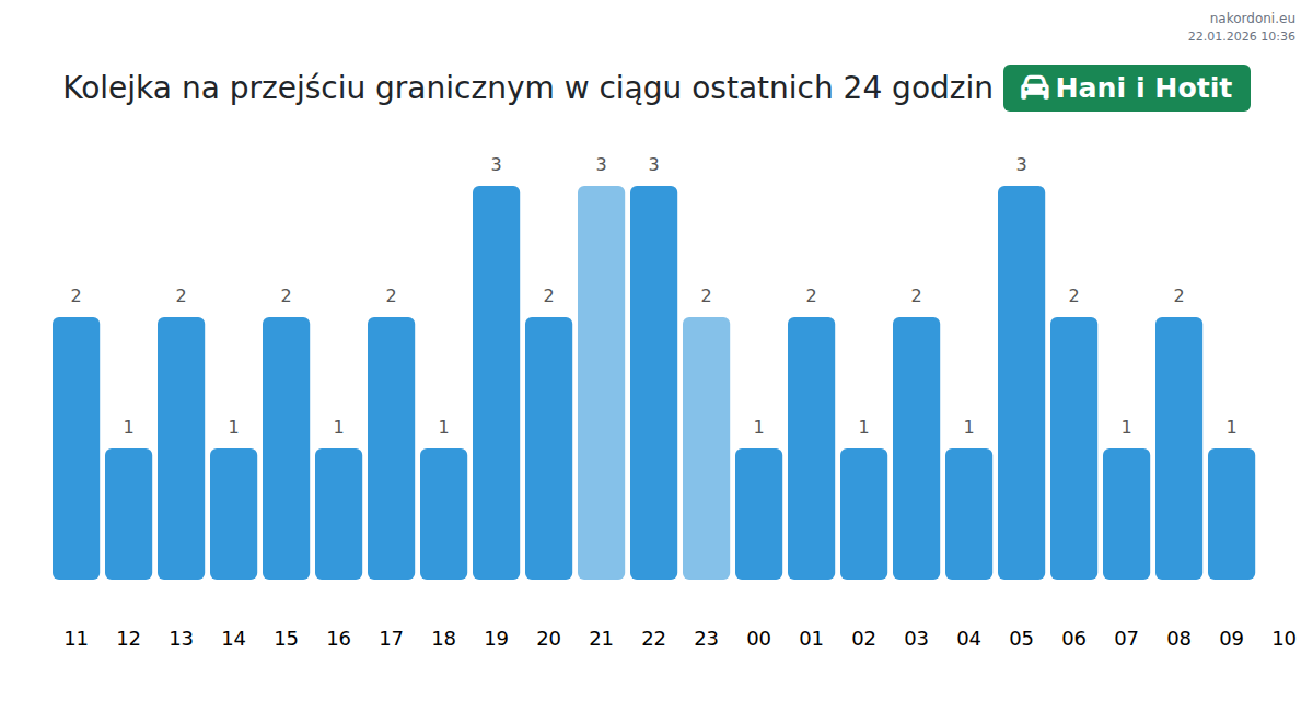 Planuj swoje podróże z wyprzedzeniem, korzystając z aktualnych informacji o kolejkach na granicy na punkcie kontrolnym Hani i Hotit - samochód osobowy, aby przejazd był szybki i wygodny. Zwróć szczególną uwagę na te godziny, aby uniknąć szczytowego natężenia i skrócić czas oczekiwania.