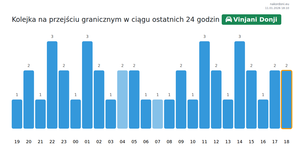 Planuj swoje podróże z wyprzedzeniem, korzystając z aktualnych informacji o kolejkach na granicy na punkcie kontrolnym Vinjani Donji - samochód osobowy, aby przejazd był szybki i wygodny. Zwróć szczególną uwagę na te godziny, aby uniknąć szczytowego natężenia i skrócić czas oczekiwania.