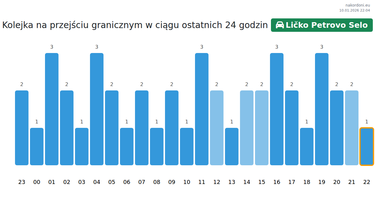 Aby uniknąć długich kolejek na granicy na punkcie kontrolnym Ličko Petrovo Selo - samochód osobowy, zaleca się planowanie przekraczania granicy w godzinach najmniejszego obciążenia. Według danych z ostatniego dnia, najmniejsza liczba pojazdów była obserwowana między 2:00 a 5:00 godziną. To idealny czas na przekroczenie granicy, oszczędzając czas i unikając opóźnień.