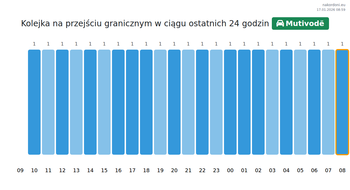 Planuj swoje podróże z wyprzedzeniem, korzystając z aktualnych informacji o kolejkach na granicy na punkcie kontrolnym Mutivodë - samochód osobowy, aby przejazd był szybki i wygodny. Zwróć szczególną uwagę na te godziny, aby uniknąć szczytowego natężenia i skrócić czas oczekiwania.