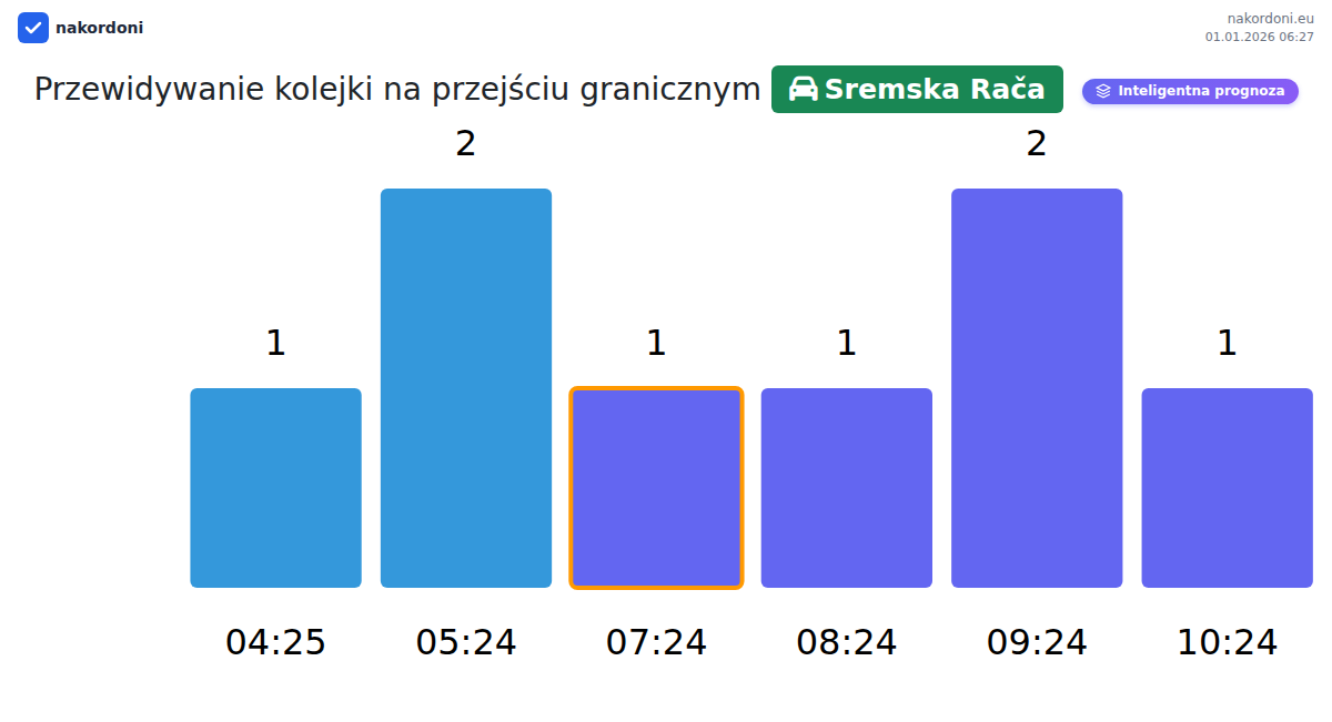 Planuj swoje podróże z wyprzedzeniem, korzystając z aktualnych informacji o kolejkach na granicy na punkcie kontrolnym Sremska Rača - samochód osobowy, aby przejazd był szybki i wygodny. Zwróć szczególną uwagę na te godziny, aby uniknąć szczytowego natężenia i skrócić czas oczekiwania.