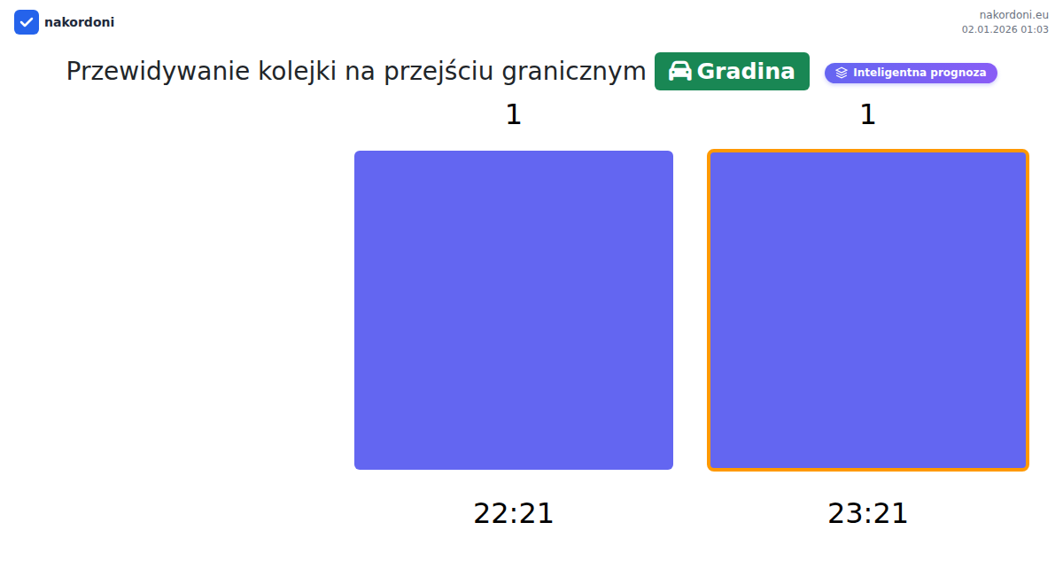 Planuj swoje podróże z wyprzedzeniem, korzystając z aktualnych informacji o kolejkach na granicy na punkcie kontrolnym Gradina - samochód osobowy, aby przejazd był szybki i wygodny. Zwróć szczególną uwagę na te godziny, aby uniknąć szczytowego natężenia i skrócić czas oczekiwania.