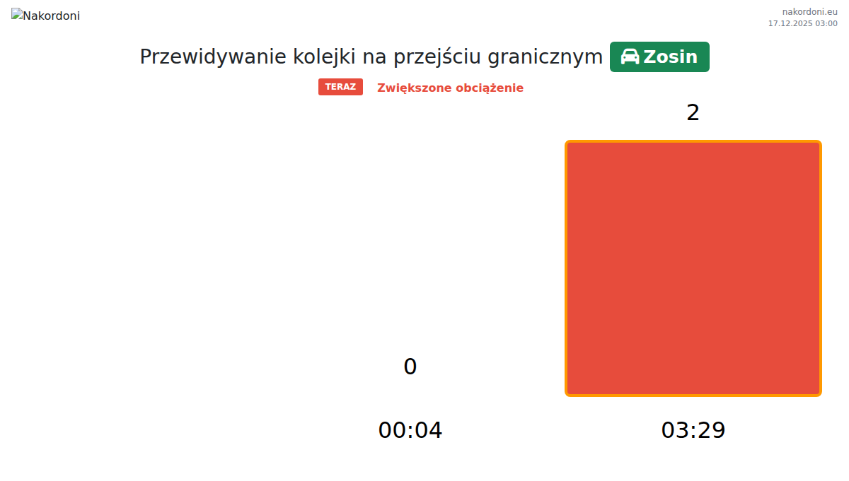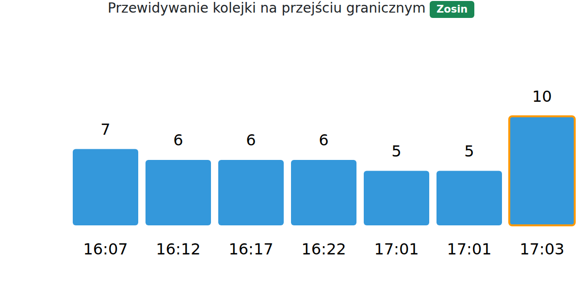 Planuj swoje podróże z wyprzedzeniem, korzystając z aktualnych informacji o kolejkach na granicy na punkcie kontrolnym Zosin - samochód osobowy, aby przejazd był szybki i wygodny. Zwróć szczególną uwagę na te godziny, aby uniknąć szczytowego natężenia i skrócić czas oczekiwania.