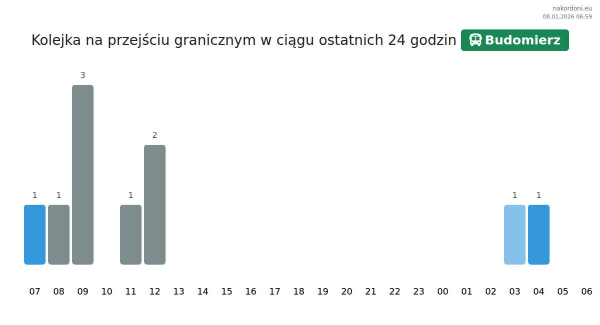 Na przejściu Budomierz czas oczekiwania dla autobusów wynosi od 15 do 1055 minut. Godziny szczytu to 02:00, 13:00 i 14:00. Najlepiej zaplanować podróż na 10:00, 12:00 lub 15:00, aby uniknąć kolejek.