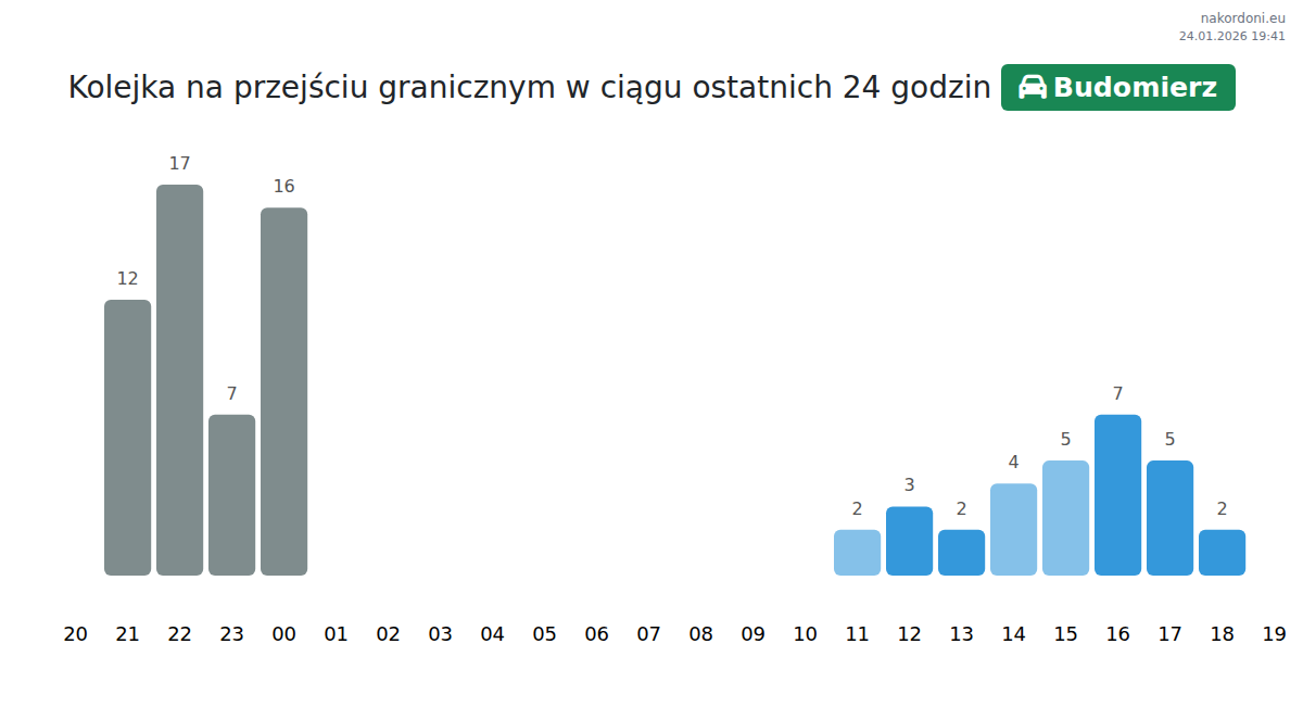 Na przejściu granicznym Budomierz czas oczekiwania dla samochodów osobowych wynosi 15-63 minuty. Unikaj godzin szczytu: 14:00, 19:00, 18:00. Najlepsze godziny na przekroczenie to 22:00, 03:00, 04:00.
