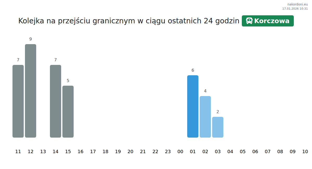 Na przejściu granicznym Korczowa czas oczekiwania dla autobusów wynosi od 15 do 1135 minut. Unikaj godzin szczytu (07:00, 00:00, 02:00) i zaplanuj przejazd na 17:00, 16:00 lub 18:00, aby trafić na najkrótsze kolejki.