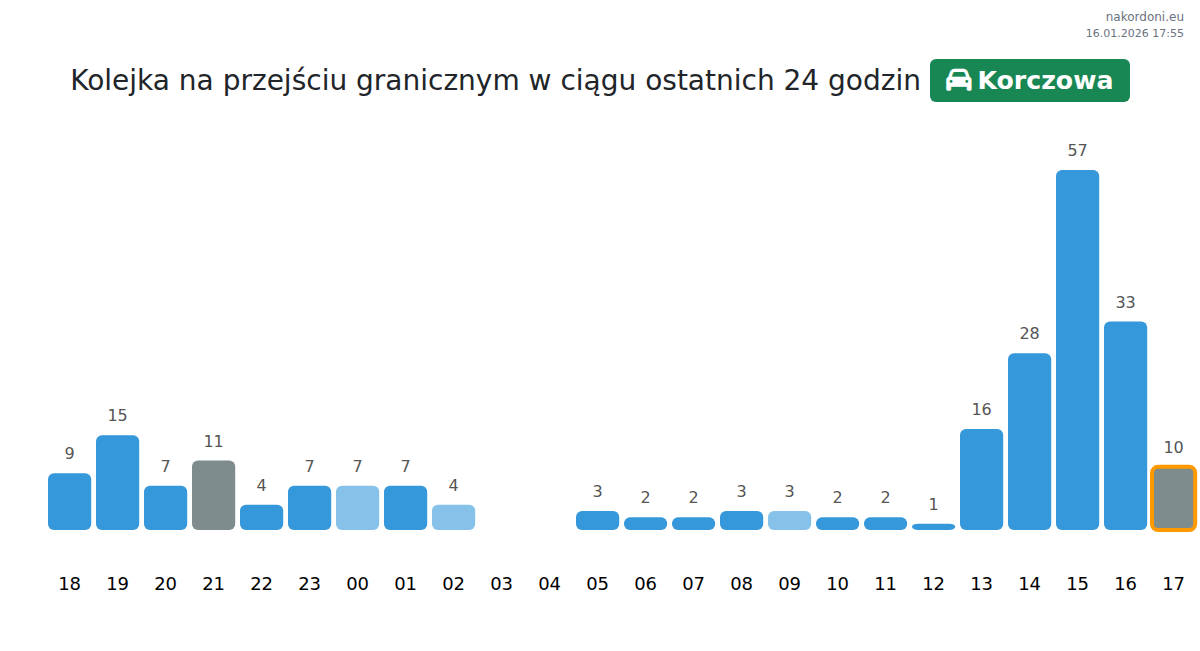 Czas oczekiwania dla samochodów osobowych w Korczowej wyniesie od 31 do 151 minut. Największy ruch przewidywany jest o 13:00, 14:00 i 00:00, natomiast najlepsze godziny na przejazd to 05:00, 06:00 oraz 23:00.