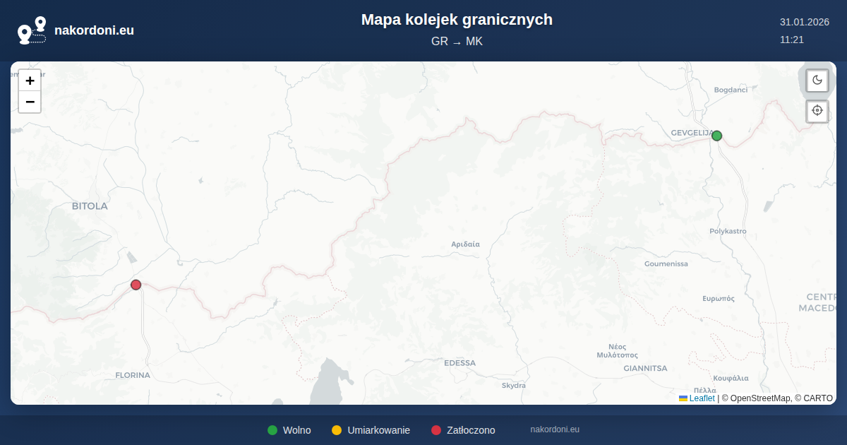 Interaktywna mapa granicy Grecja — Macedonia Północna z kolejkami na żywo, prognozą i statusem przejść