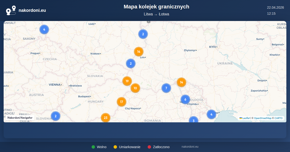 Interaktywna mapa granicy Litwa — Łotwa z kolejkami na żywo, prognozą i statusem przejść