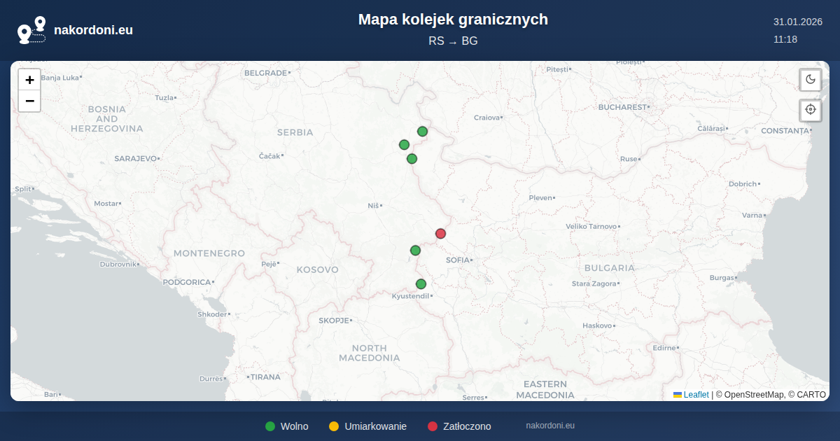 Interaktywna mapa granicy Serbia — Bułgaria z kolejkami na żywo, prognozą i statusem przejść