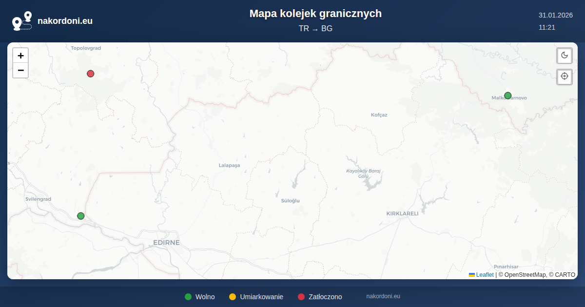 Interaktywna mapa granicy Turcja — Bułgaria z kolejkami na żywo, prognozą i statusem przejść