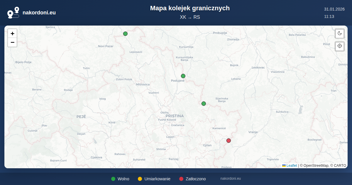 Interaktywna mapa granicy Kosowo — Serbia z kolejkami na żywo, prognozą i statusem przejść