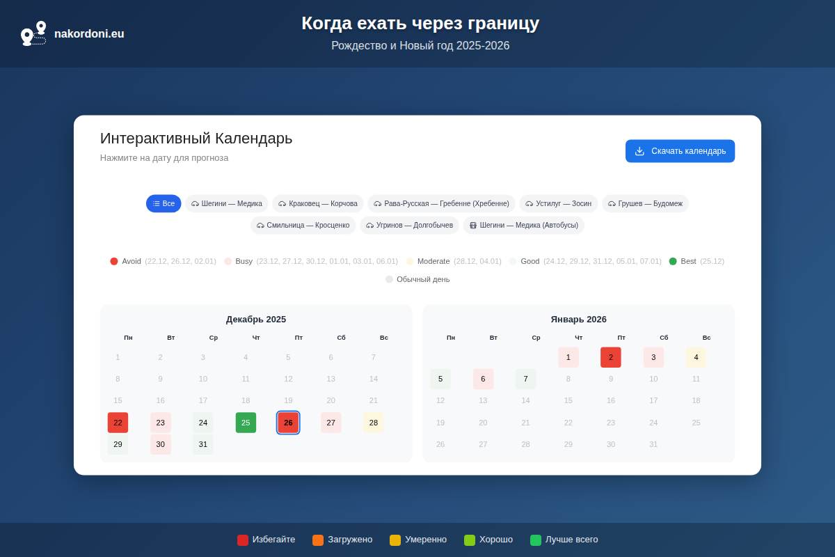During the holiday period 22.12–07.01.2026, expect increased traffic at the border. We track queues at 16 checkpoints in real-time.