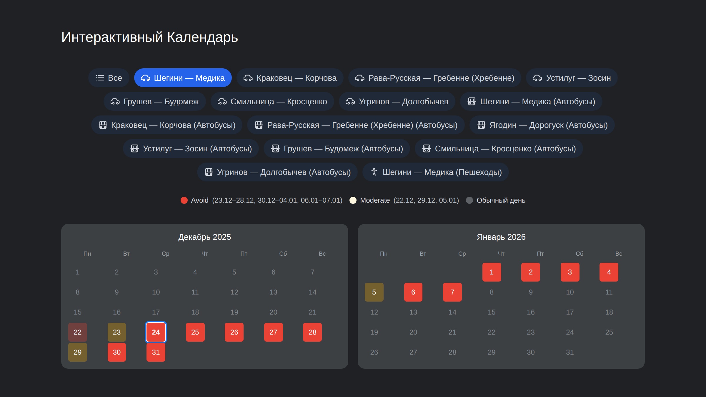Avoid these days: 6, 7, 22, 23, 24, 25, 31 (up to 420+ хв). Peak days — Christmas Eve, New Year's.