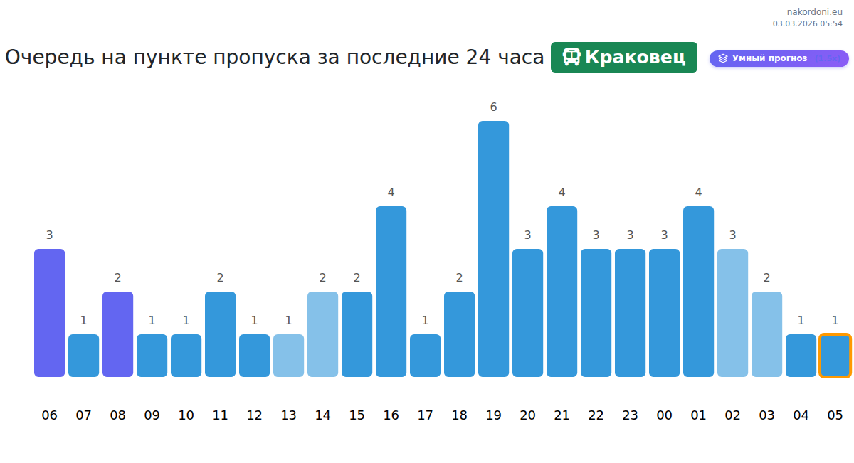 Чтобы избежать длинных очередей на границе на пункте пропуска Краковец - автобус, рекомендуем планировать пересечение границы в часы наименьшей нагрузки. Согласно данным за прошлые сутки, наименьшее количество автомобилей наблюдалось между 4:00 и 5:00 часами. Это идеальное время для пересечения границы, чтобы сэкономить время и избежать задержек.