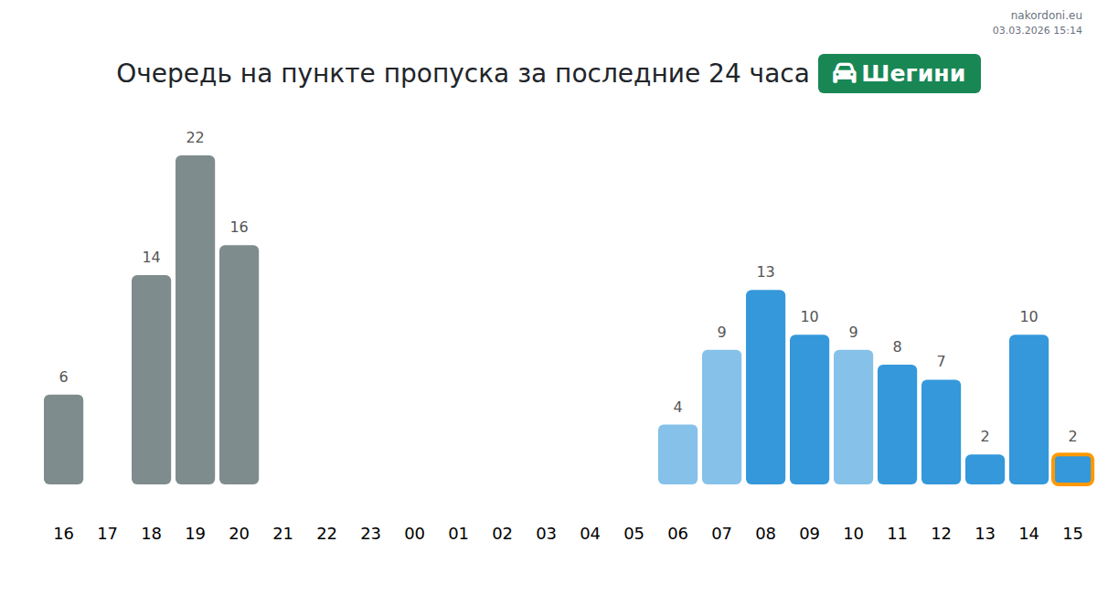 Чтобы избежать длинных очередей на границе на пункте пропуска Шегини - легковой автомобиль, рекомендуем планировать пересечение границы в часы наименьшей нагрузки. Согласно данным за прошлые сутки, наименьшее количество автомобилей наблюдалось между :00 и 6:00 часами. Это идеальное время для пересечения границы, чтобы сэкономить время и избежать задержек.