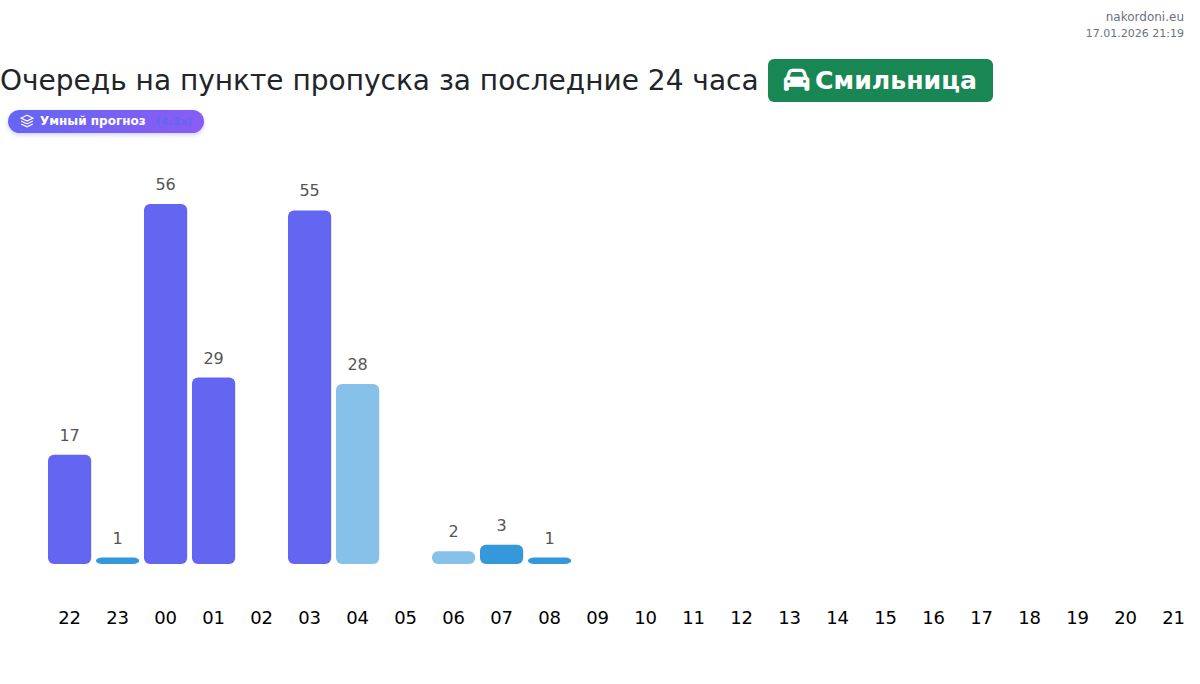 Чтобы избежать длинных очередей на границе на пункте пропуска Смильница - легковой автомобиль, рекомендуем планировать пересечение границы в часы наименьшей нагрузки. Согласно данным за прошлые сутки, наименьшее количество автомобилей наблюдалось между 5:00 и 8:00 часами. Это идеальное время для пересечения границы, чтобы сэкономить время и избежать задержек.