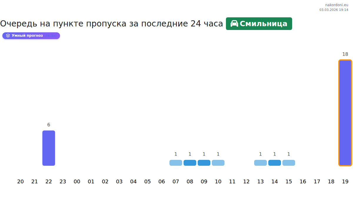 На КПП Смильница ожидайте время ожидания от 15 до 219 минут. Избегайте часов пик в 08:00, 17:00 и 11:00. Самые короткие очереди прогнозируются на 15:00, 18:00 и 21:00.