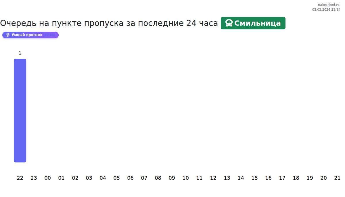 На пункте Смильница ожидаемое время ожидания для автобусов составляет от 15 до 575 минут. Чтобы минимизировать задержки, избегайте пиковых часов: 22:00, 02:00 и 14:00. Лучшее время для пересечения – 23:00, 00:00 и 05:00.