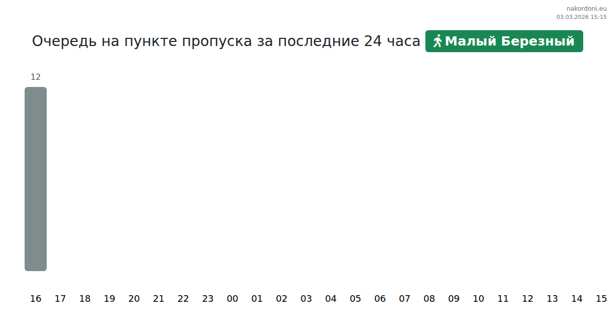 На КПП Малый Березный время ожидания для транспорта прогнозируется от 15 до 187 минут. Избегайте часов пик (14:00, 13:00, 22:00) для более быстрого пересечения. Лучшее время для проезда: 15:00, 17:00, 18:00.