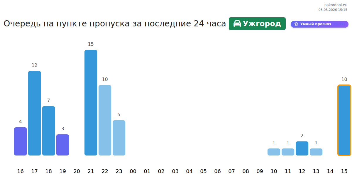На пункте пропуска Ужгород ожидайте время ожидания от 15 до 81 минуты. Избегайте пиковых часов в 13:00, 09:00 и 12:00. Для более коротких очередей рассмотрите пересечение около 18:00, 00:00 или 03:00.