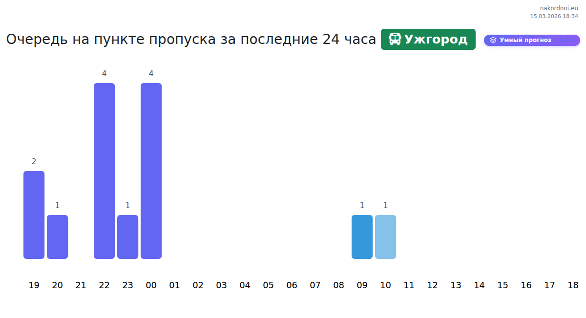 На КПП Ужгород прогнозируемое время ожидания для автобусов составляет 15-1295 минут. Чтобы избежать пиковых нагрузок, не планируйте проезд на 11:00, 02:00 и 22:00. Лучшее время для пересечения: 15:00, 05:00, 06:00.