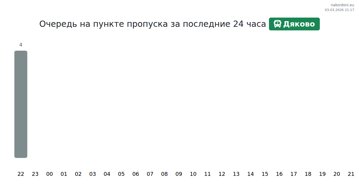 Прогнозируемое время ожидания для автобусов на КПП Дяково составляет от 15 до 735 минут. Избегайте часов пик в 21:00, 22:00 и 20:00. Лучшее время для пересечения — 23:00, 00:00 и 01:00, когда очереди короче.