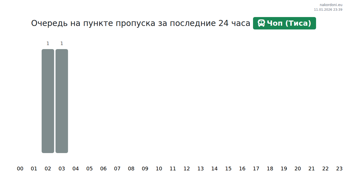 На КПП Чоп (Тиса) время ожидания для автобусов составляет от 15 до 815 минут. Рекомендуется избегать пиковых часов в 15:00, 11:00 и 13:00. Самое благоприятное время для проезда — 23:00, 02:00 или 03:00.