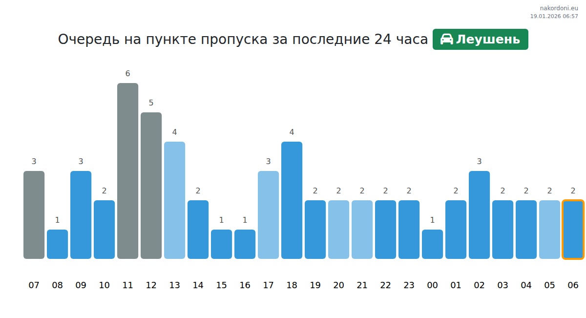 Чтобы избежать длинных очередей на границе на пункте пропуска Леушень - легковой автомобиль, рекомендуем планировать пересечение границы в часы наименьшей нагрузки. Согласно данным за прошлые сутки, наименьшее количество автомобилей наблюдалось между 1:00 и 22:00 часами. Это идеальное время для пересечения границы, чтобы сэкономить время и избежать задержек.