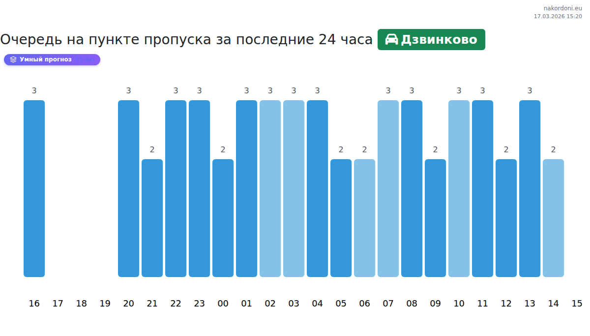 На КПП Дзвинково время ожидания составляет 15-609 мин. Рекомендуется избегать пиковых часов в 11:00, 20:00 и 01:00. Оптимальное время для пересечения границы — 09:00, 10:00 или 12:00.