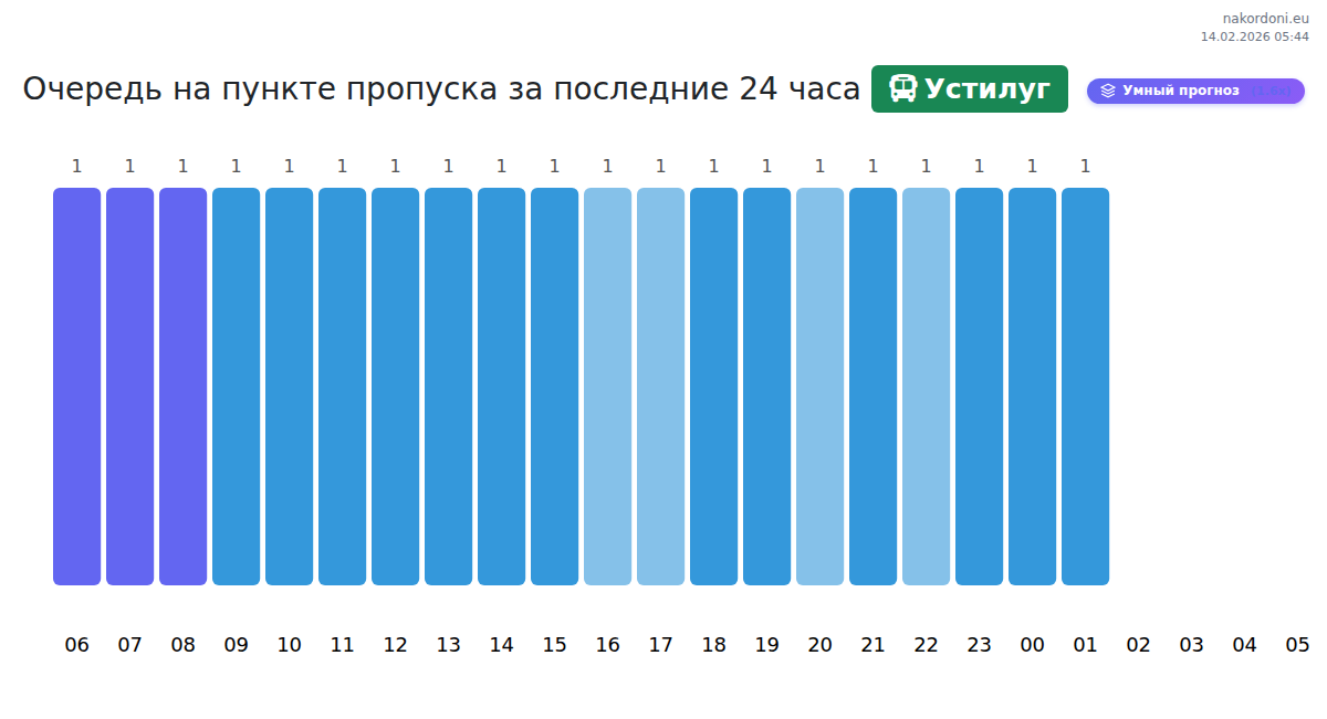 На Устилуге автобусы могут ожидать от 15 до 575 минут. Избегайте пиковых часов: 22:00, 04:00, 03:00. Лучшее время для пересечения: 18:00, 23:00, 00:00 для более коротких очередей.