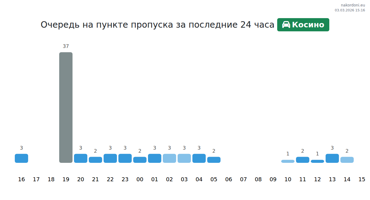 На пункте Косино, легковые автомобили ожидают от 15 до 201 минуты, в среднем 37 минут. Пиковые часы: 10:00, 17:00, 03:00. Наименьшие очереди ожидаются около 15:00, 18:00, 19:00.