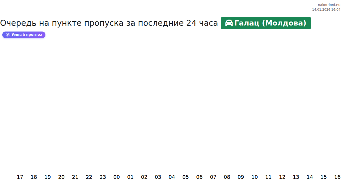 Время ожидания в Галац (Молдова) для легковых машин — от 15 до 10015 минут. Избегайте пиков в 09:00, 14:00 и 15:00. Лучшее время для проезда — 20:00, 22:00 или 23:00, когда очереди минимальны.