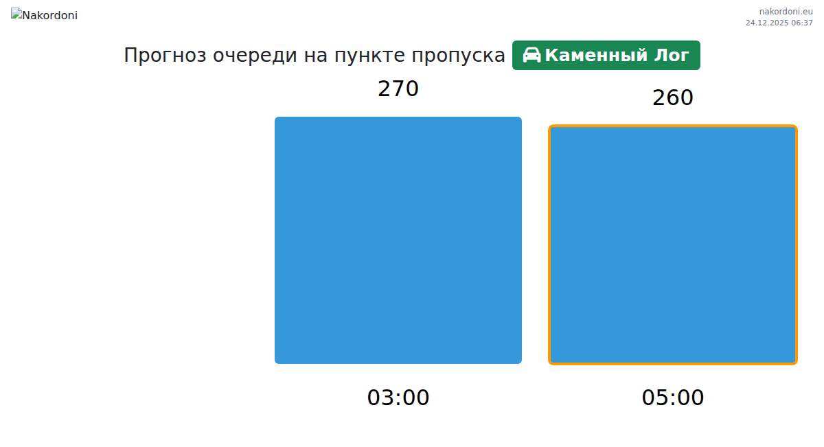 Сегодня на пункте пропуска Каменный Лог ожидаемая очередь для грузовиков составляет 2180–2810 минут. Пики нагрузки ожидаются в 06:00, 04:00, 05:00, тогда как наименьшие очереди прогнозируются в 23:00, 03:00, 22:00. Среднее время ожидания в течение дня — около 2498 минут. Прогноз учитывает дневной профиль и текущие условия.