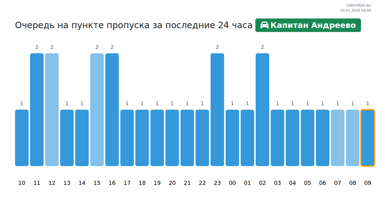Чтобы избежать длинных очередей на границе на пункте пропуска Капитан Андреево - легковой автомобиль, рекомендуем планировать пересечение границы в часы наименьшей нагрузки. Согласно данным за прошлые сутки, наименьшее количество автомобилей наблюдалось между :00 и 1:00 часами. Это идеальное время для пересечения границы, чтобы сэкономить время и избежать задержек.