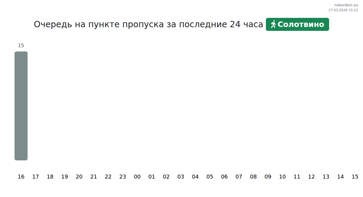 На пункте пропуска Солотвино ожидание составляет 15-111 мин. Рекомендуем избегать часов пик в 08:00, 09:00 и 14:00. Лучшее время для перехода — 10:00, 11:00 и 12:00, когда очереди минимальны.