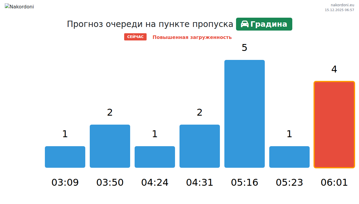 Планируйте свои поездки заранее, используя актуальную информацию о очередях на границе на пункте пропуска Градина - легковой автомобиль, чтобы сделать ваш переход быстрым и удобным. Обратите особое внимание на эти часы, чтобы избежать пиковых нагрузок и сократить время ожидания.