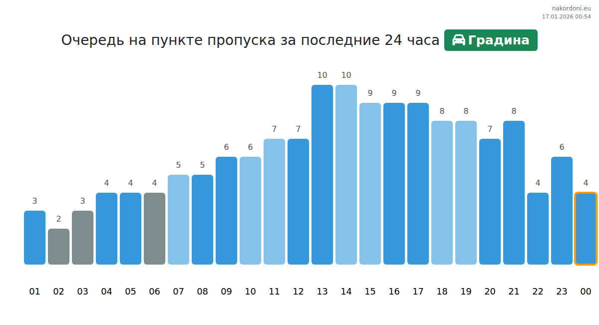 Чтобы избежать длинных очередей на границе на пункте пропуска Градина - легковой автомобиль, рекомендуем планировать пересечение границы в часы наименьшей нагрузки. Согласно данным за прошлые сутки, наименьшее количество автомобилей наблюдалось между :00 и 4:00 часами. Это идеальное время для пересечения границы, чтобы сэкономить время и избежать задержек.