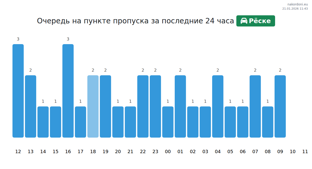 Чтобы избежать длинных очередей на границе на пункте пропуска Рёске - легковой автомобиль, рекомендуем планировать пересечение границы в часы наименьшей нагрузки. Согласно данным за прошлые сутки, наименьшее количество автомобилей наблюдалось между :00 и 2:00 часами. Это идеальное время для пересечения границы, чтобы сэкономить время и избежать задержек.