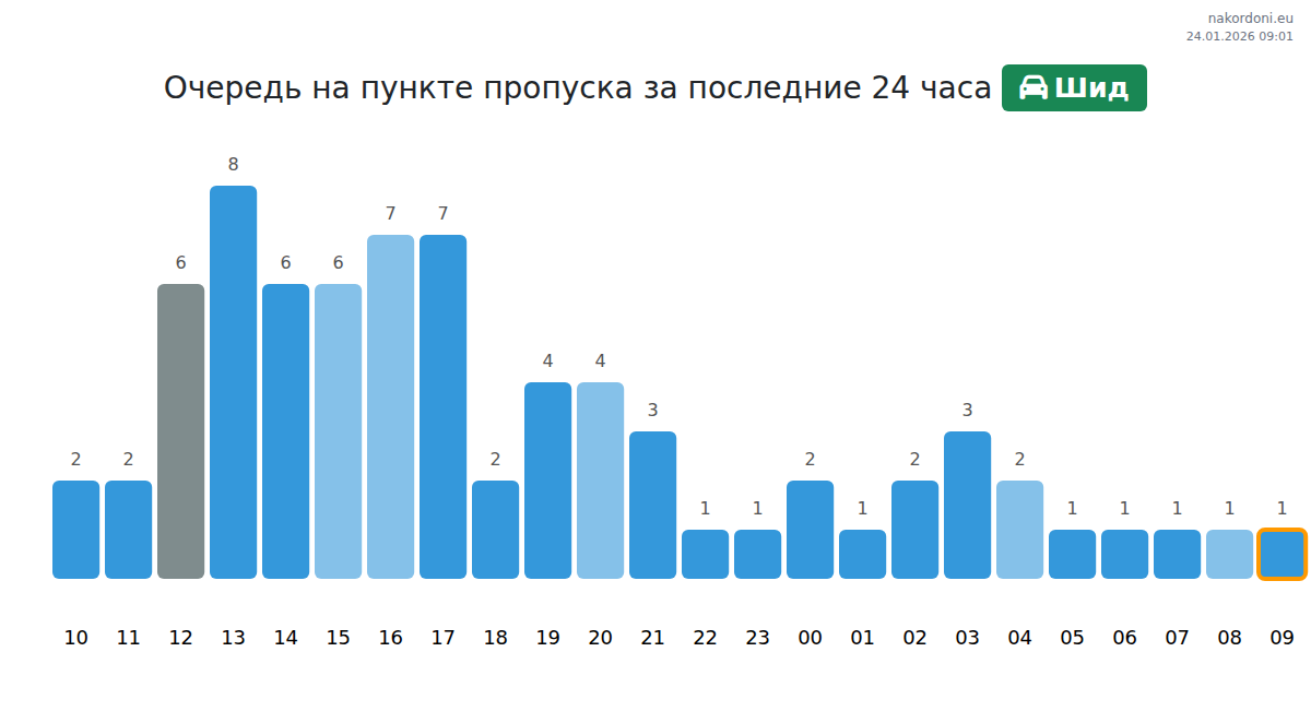 Чтобы избежать длинных очередей на границе на пункте пропуска Шид - легковой автомобиль, рекомендуем планировать пересечение границы в часы наименьшей нагрузки. Согласно данным за прошлые сутки, наименьшее количество автомобилей наблюдалось между :00 и 1:00 часами. Это идеальное время для пересечения границы, чтобы сэкономить время и избежать задержек.