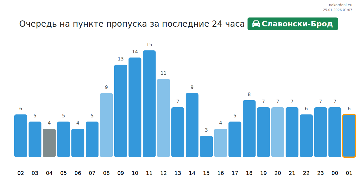 Планируйте свои поездки заранее, используя актуальную информацию о очередях на границе на пункте пропуска Славонски-Брод - легковой автомобиль, чтобы сделать ваш переход быстрым и удобным. Обратите особое внимание на эти часы, чтобы избежать пиковых нагрузок и сократить время ожидания.
