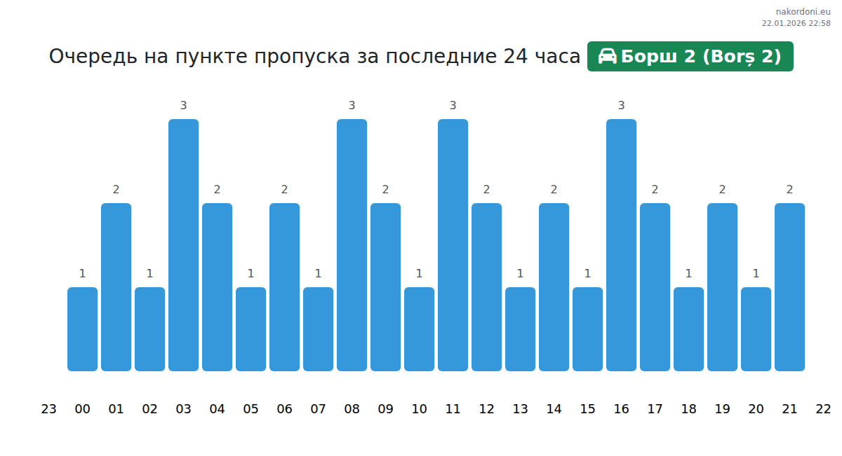 Планируйте свои поездки заранее, используя актуальную информацию о очередях на границе на пункте пропуска Борш 2 (Borș 2) - легковой автомобиль, чтобы сделать ваш переход быстрым и удобным. Обратите особое внимание на эти часы, чтобы избежать пиковых нагрузок и сократить время ожидания.