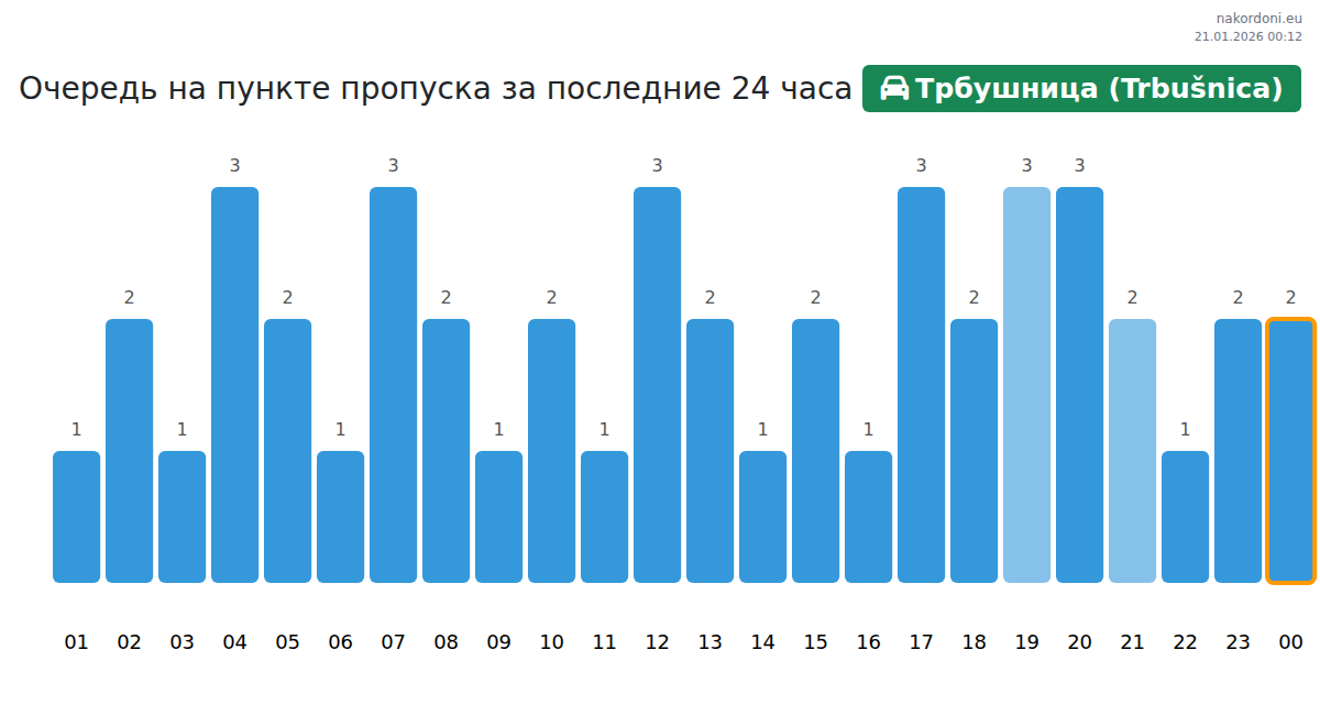 Планируйте свои поездки заранее, используя актуальную информацию о очередях на границе на пункте пропуска Трбушница (Trbušnica) - легковой автомобиль, чтобы сделать ваш переход быстрым и удобным. Обратите особое внимание на эти часы, чтобы избежать пиковых нагрузок и сократить время ожидания.
