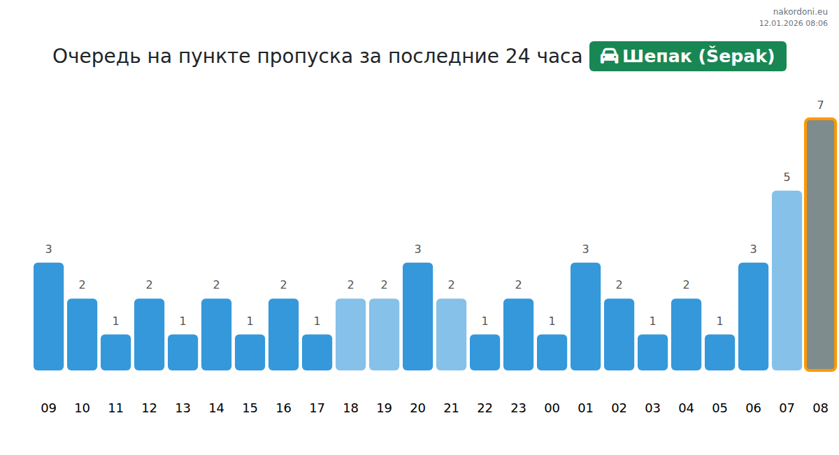 Планируйте свои поездки заранее, используя актуальную информацию о очередях на границе на пункте пропуска Шепак (Šepak) - легковой автомобиль, чтобы сделать ваш переход быстрым и удобным. Обратите особое внимание на эти часы, чтобы избежать пиковых нагрузок и сократить время ожидания.