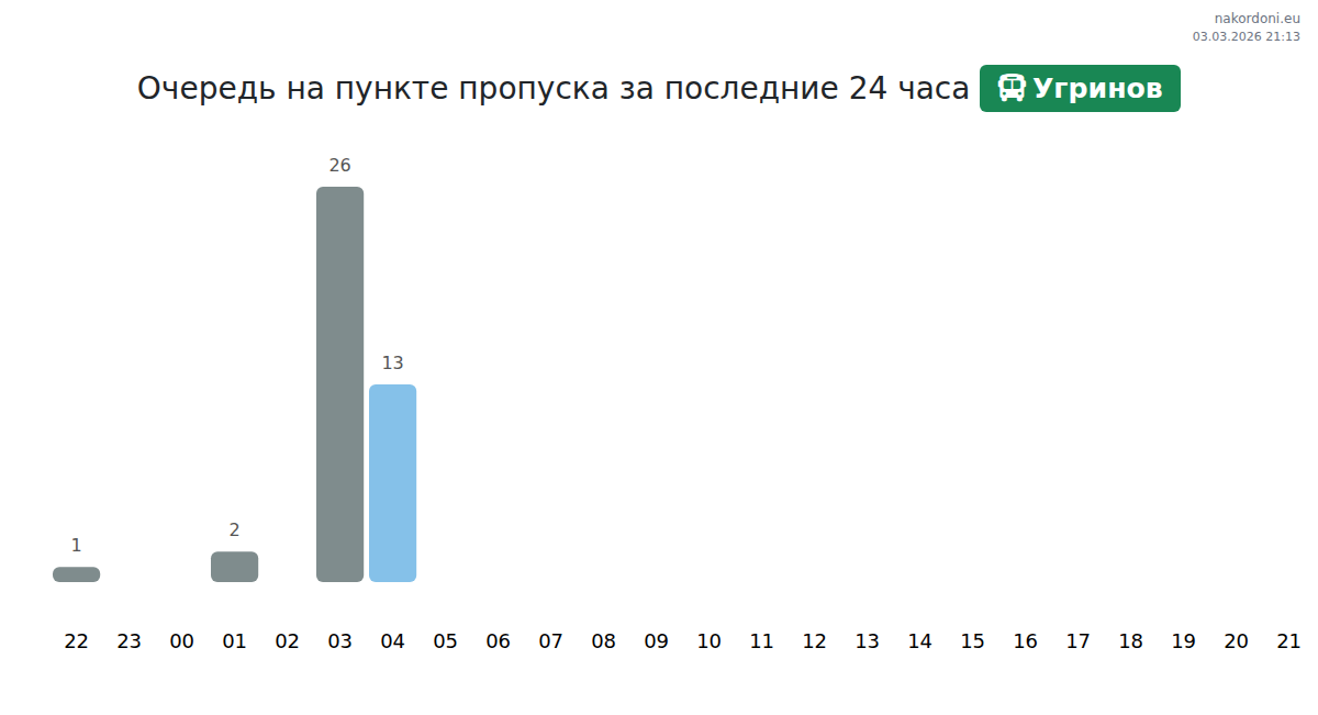 На КПП Угринов время ожидания для автобусов составляет от 15 до 1615 минут. Избегайте пересечения границы около 02:00, 10:00 и 01:00 из-за пиковой нагрузки. Для коротких очередей лучшее время: 15:00, 18:00 или 21:00.